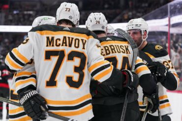 Jake Debrusk lance une rondelle de la vitre du panneau et la claque devant le filet pour marquer sur un…