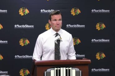 Les Blackhawks de Chicago, Colin Blackwell, Kevin Korchinski et l’entraîneur-chef Luke Richardson s’adressent aux médias après le match après la…