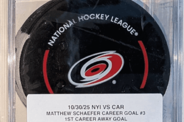 Je suis ravi de décrocher celui-ci : rondelle de but utilisée par le match pour le but n°3 en carrière de…