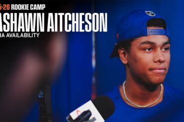 Le prospect des îles de New York Kashawn Aitcheson parle avec les médias en suivi 1 du camp recrue des…