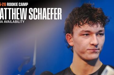 Le prospect des insulaires de New York, Matthew Schaefer, parle avec les médias après le premier jour du camp recrue…