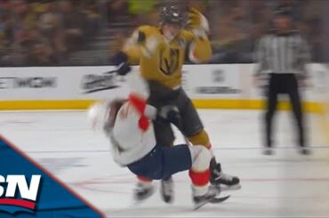 Regardez l’attaquant des Golden Knights de Vegas Ivan Barbashev niveler le défenseur des Panthers de la Floride Radko Gudas avec…
