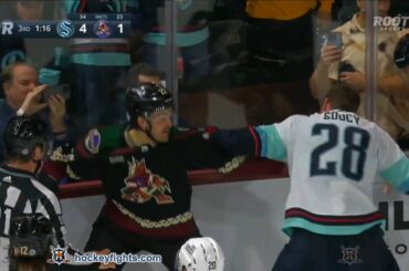 Carson Soucy contre Jack McBain du Seattle Kraken au match des Coyotes de l’Arizona le 10 avril 2023. via https://www.hockeyfights.com