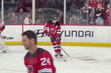 La superstar des Devils du New Jersey, Jack Hughes, s’échauffe avant le match préparatoire des Devils 10/2 contre les Islanders…