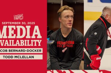 Jacob Bernard-Docker et Todd McLellan parlent avec les médias après le patin matinal de Détroit à Little Caesars Arena le…