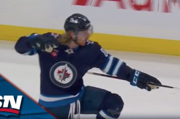 Regardez alors que l’attaquant des Jets de Winnipeg Kyle Connor déjoue le gardien des Flames de Calgary Jacob Markstrom sur…
