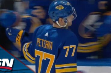 Regardez l’attaquant des Sabres de Buffalo JJ Peterka faire preuve de créativité et marquer en envoyant la rondelle dans le…
