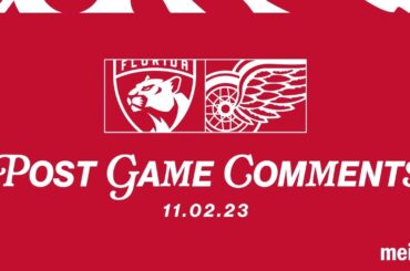 James Reimer, Dylan Larkin et l’entraîneur-chef Derek Lalonde parlent avec les médias après le match des Red Wings contre les…