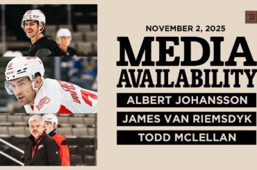 Albert Johansson, James van Riemsdyk et Todd McLellan parlent avec les médias après l’entraînement matinal de Detrot à San Jose…