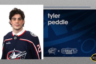Tyler Peddle s’adresse aux médias après avoir été sélectionné par les Blue Jackets de Columbus lors du repêchage 2023 de…