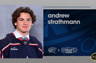 Andrew Strathmann s’adresse aux médias après avoir été sélectionné par les Blue Jackets de Columbus lors du repêchage 2023 de…