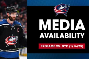 Boone Jenner et l’entraîneur Brad Larsen s’adressent aux médias avant le match de ce soir contre les Rangers de New…
