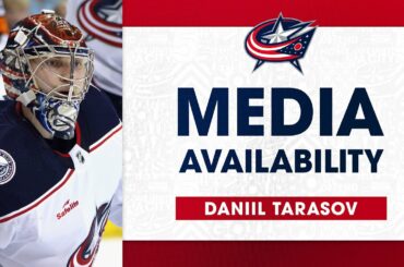 Daniil Tarasov s’adresse aux médias après sa première victoire dans la LNH – une victoire de 5-1 contre les Rangers…