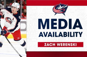 Zach Werenski s’adresse aux médias avant le match de ce soir contre les Hurricanes de la Caroline le 12 octobre…