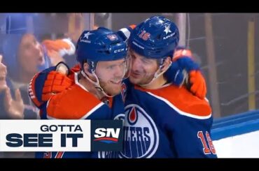 Regardez le défenseur des Oilers d’Edmonton Evan Bouchard marquer le but vainqueur du point avec 38 secondes à jouer lors…