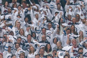 Les partisans de Winnipeg habillés pour les Jets Whiteout chantent avec Stacey Nattrass pendant l’hymne national canadien avant le premier…