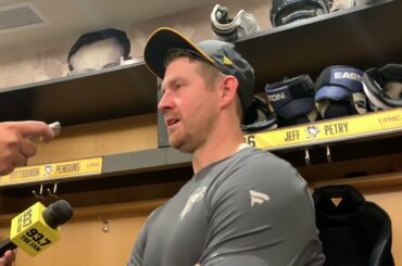 Le défenseur des Penguins Jeff Petry parle après la victoire de 6-2 des Penguins lors du premier match de la…