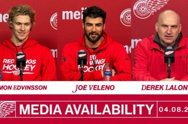 Simon Edvinsson, Joe Veleno et Derek Lalonde parlent avec les médias après l’entraînement des Red Wings, le lundi 9 avril…
