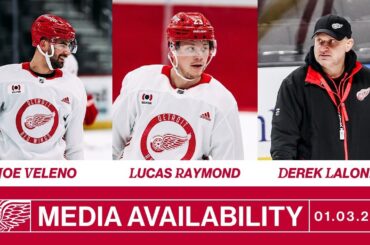 Lucas Raymond, Joe Veleno et Derek Lalonde parlent aux médias après l’entraînement de Detroit à Los Angeles le mercredi 3…