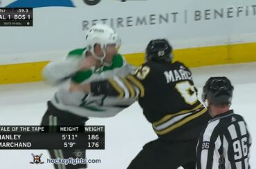Joel Hanley contre Brad Marchand des Stars de Dallas lors du match des Bruins de Boston le 19 février 2024.…