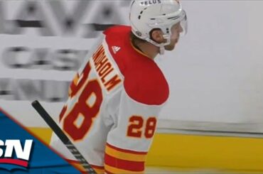 Regardez comment l’attaquant des Flames de Calgary Elias Lindholm reçoit une passe de Tyler Toffoli et se termine pour lancer…