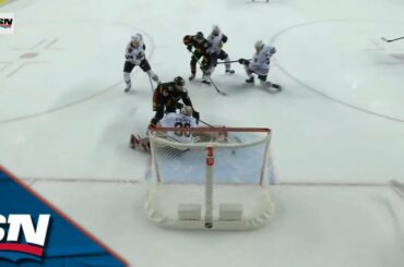 Regardez l’attaquant des Flames de Calgary, Jonathan Huberdeau, ramasser la rondelle après une excellente entrée de Nazem Kadri et attaquer…