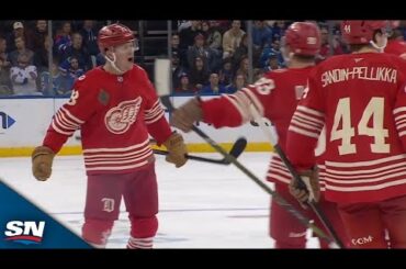 Regardez Lucas Raymond des Red Wings de Détroit attendre le gardien des Rangers de New York Jonathan Quick pour tenter…
