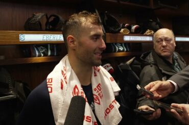 L’attaquant et capitaine adjoint du Seattle Kraken Jordan Eberle s’entretient avec les médias après une victoire contre Nashville.