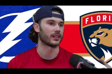 Le défenseur des Panthers de la Floride Josh Mahura parle après la défaite de son équipe contre le Lightning de…