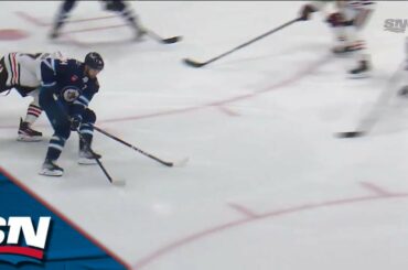 Regardez le défenseur des Jets de Winnipeg Josh Morrissey arrêter une tentative de dégagement des Blackhawks de Chicago, patiner vers…