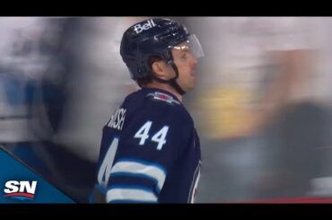 Regardez le défenseur des Jets de Winnipeg Josh Morrissey filer une rondelle devant le gardien de but de l’Avalanche du…