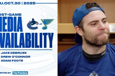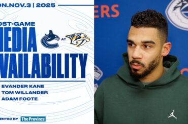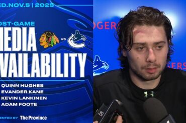 Quinn Hughes, Conor Garland et Brett McLean parlent avec les médias avant le match de mercredi soir contre les Blackhawks…