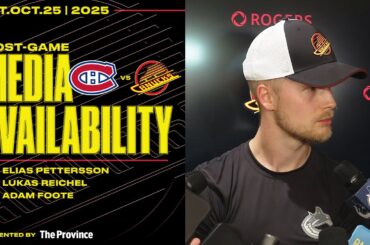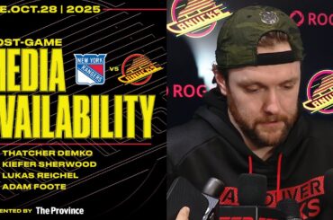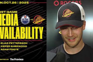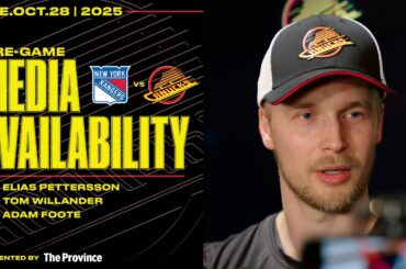 Elias Pettersson, Tom Willander et Adam Foote s’adressent aux médias avant le match de ce soir contre les Rangers. Si…