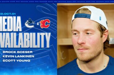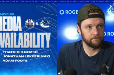 Thatcher Demko, Jonathan Lekkerimäki et l’entraîneur-chef Adam Foote parlent aux médias après la victoire 3-2 en prolongation contre les Oilers…