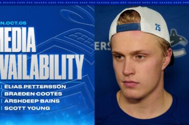 Elias Pettersson, Braeden Cootes, Arshdeep Bains et Scott Young parlent avec les médias après un entraînement à l’UBC. Si vous…