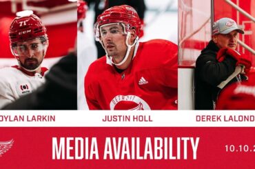 Justin Holl, Dylan Larkin (1:32) et Derek Lalonde (4:05) parlent avec les médias après l’entraînement de Détroit au centre d’entraînement…