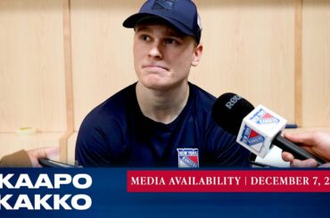 L’attaquant des Rangers de New York Kaapo Kakko répond aux questions des médias après le match du 7 décembre contre…