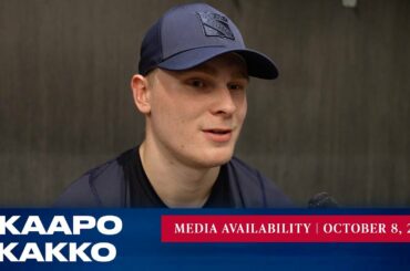 L’attaquant des Rangers de New York Kaapo Kakko répond aux questions des médias après le match du 8 octobre contre…