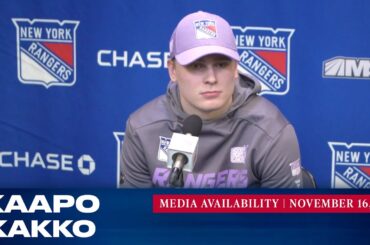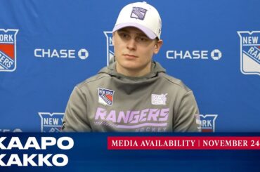 L’attaquant des New York Rangers Kaapo Kakko répond aux questions des médias avant le match du 24 novembre contre les…