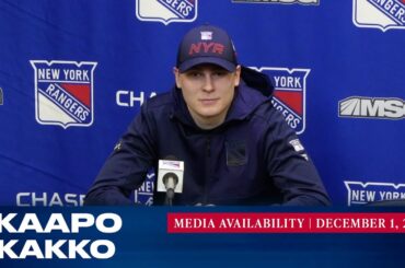 L’attaquant des Rangers de New York Kaapo Kakko répond aux questions des médias après le match du 1er décembre contre…