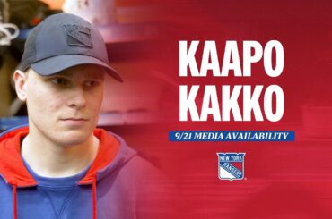 L’attaquant des Rangers de New York, Kaapo Kakko, répond aux questions des médias après la première journée du camp d’entraînement,…
