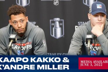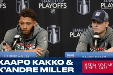 L’attaquant des Rangers de New York Kaapo Kakko et le défenseur K’Andre Miller répondent aux questions des médias avant le…