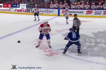 Kaiden Guhle vs Max Domi des Canadiens de Montréal à Toronto Maple Leafs le 12 avril 2025. Via https://www.hockeyfights.com