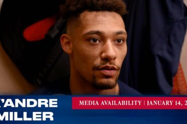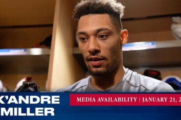 Le défenseur des Rangers de New York K’Andre Miller répond aux questions des médias après l’entraînement du 21 janvier. »…