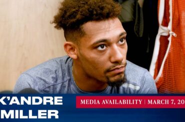 Le défenseur des Rangers de New York, K’Andre Miller, répond aux questions des médias après l’entraînement du 7 mars. »…