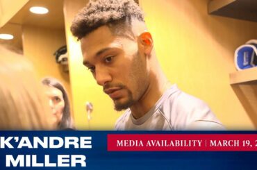 Le défenseur des Rangers de New York, K’Andre Miller, répond aux questions des médias après le match du 19 mars…