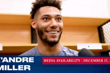 Le défenseur des Rangers de New York K’Andre Miller répond aux questions des médias après le match du 17 décembre…