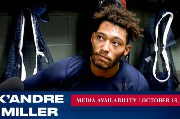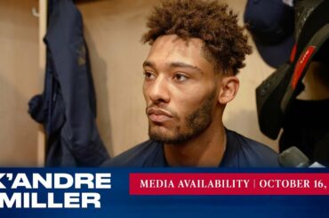 Le défenseur des Rangers de New York K’Andre Miller répond aux questions des médias après l’entraînement du 16 octobre. »…