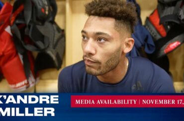 Le défenseur des Rangers de New York, K’Andre Miller, répond aux questions des médias avant le match du 17 novembre…