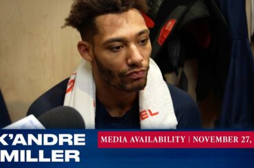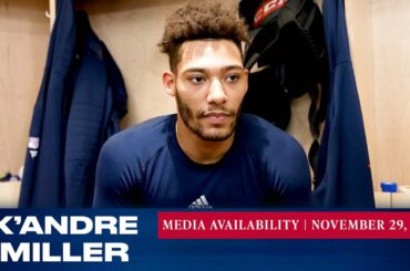 Le défenseur des Rangers de New York K’Andre Miller répond aux questions des médias après l’entraînement du 27 novembre. »…